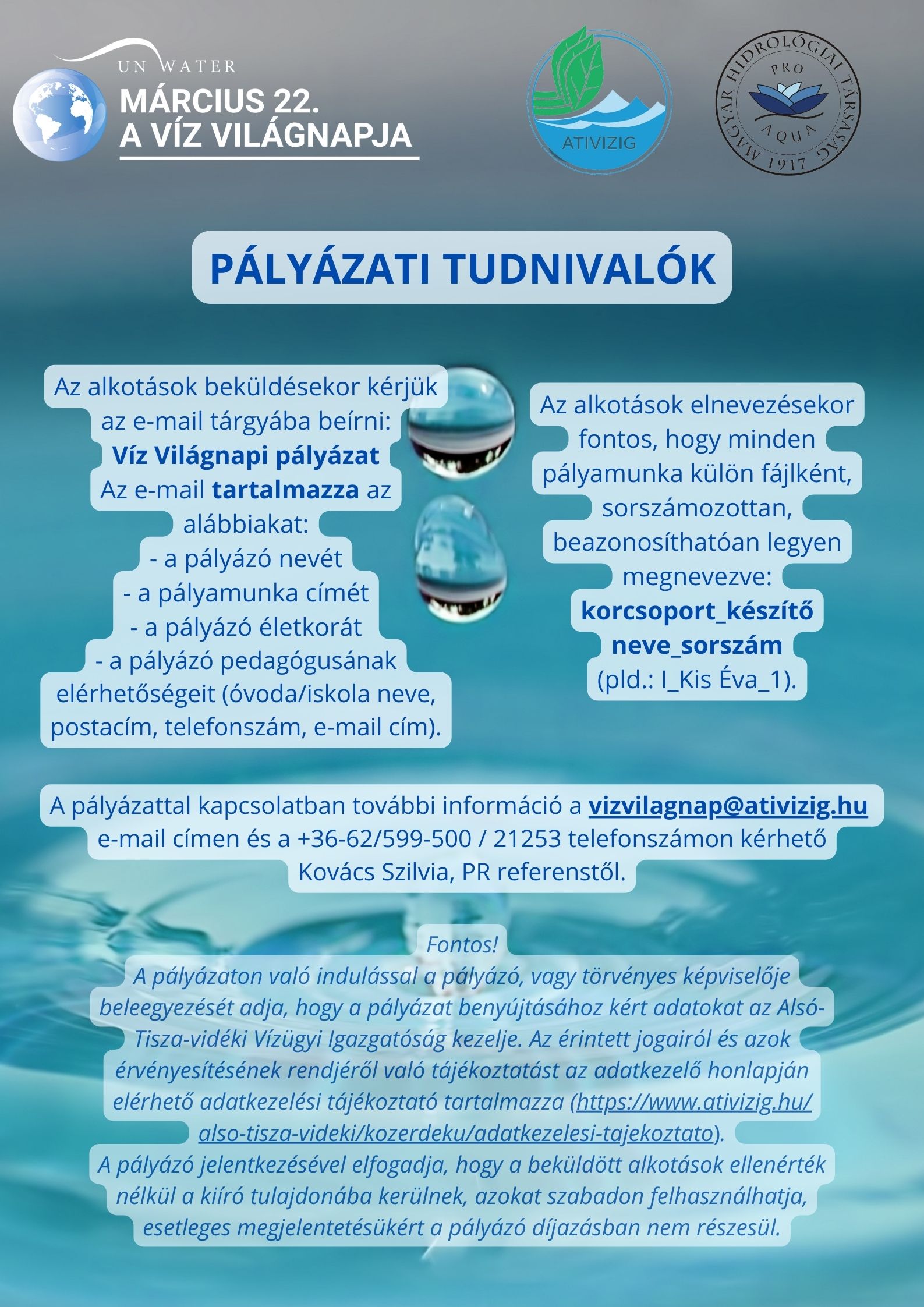 A pályázattal kapcsolatban további információ a vizvilagnap@ativizig.hu e-mail címen és a +36-62/599-500 / 21253 mellék telefonszámon kérhető Kovács Szilvia, PR referenstől.