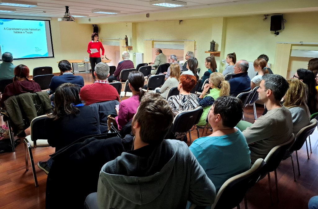 A ciánszennyezés halélettani hatásai a Tiszán címmel tartott előadást Balogh Endre, vízminőség-védelmi referens, amelyet követően a program résztvevői egy-egy szál virágot helyeztek a Tiszába.